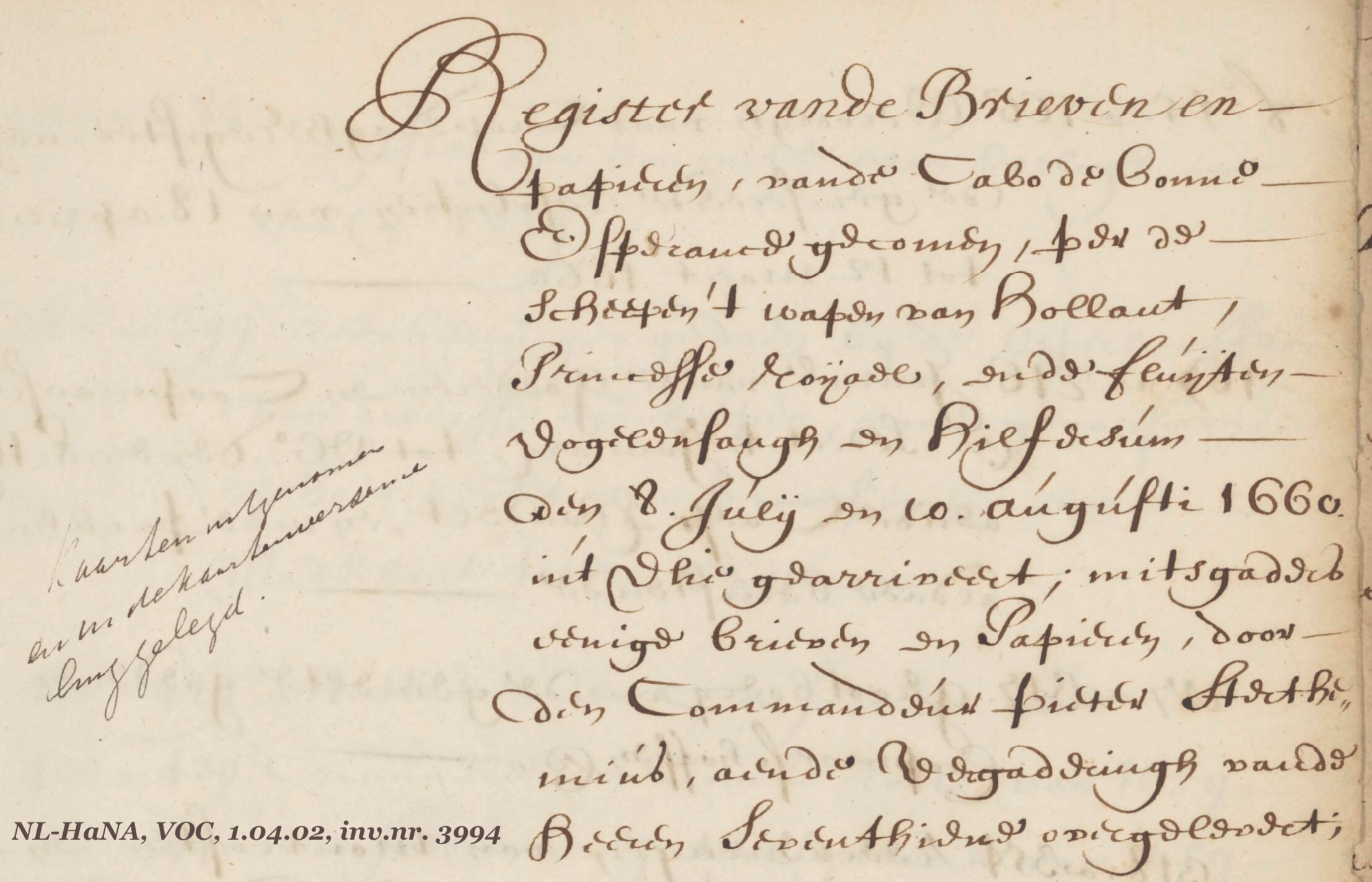 | ... | Register van de brieven en papieren van de Cabo de Bonne Esperance gecomen per de scheepen 't Wapen van Hollant, Princesse Roijael, ende fluijten Vogelensangh en Hilfersum den 8 Julij en 10 Augusti 1660 in't Vlie gearriveert, mitsgaders eenige brieven en papieren, door den Commandeur Pieter Sterthemius, aen de Vergadering van de Heeren Seventhiene overgelevert. (Kaarten meegenomen en in de kaartenverzameling gelegd) | 23 |